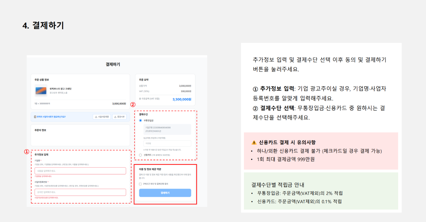 위픽부스터는 두 가지 결제 방식을 지원하고 있어요. 고객님이 편리하게 이용하실 수 있도록 후불 결제 방식을 준비하고 있어요.