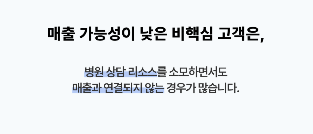 이처럼 병원은 핵심 고객에게 초점을 맞춰 적합한 고객을 선별하고, 비핵심 고객에 대한 상담 프로세스를 개선하여 매출과 치료 만족도를 함께 높이는 전략이 필요합니다.